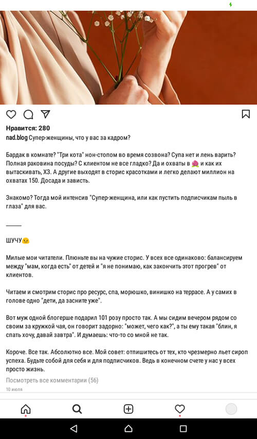 Пример — пост про супер-женщин. Автор доносит до читателей, что несмотря на образ успешных леди в Инстаграм, все эти леди точно также сталкиваются с проблемами, участвуют в бытовухе, устают. То есть, такие же люди, как и подписчики.