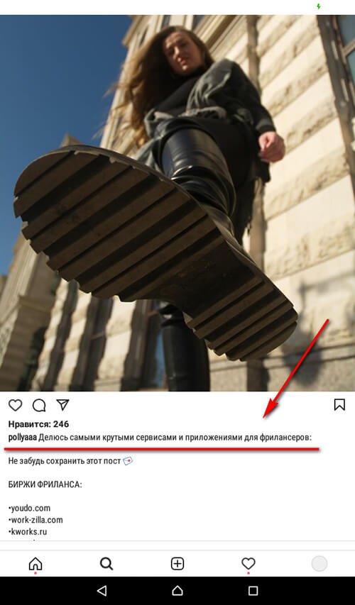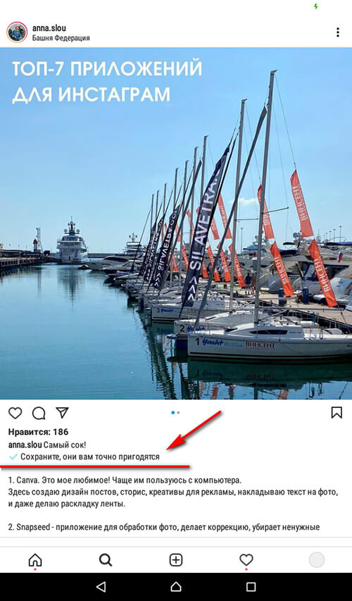 Кстати, иногда призыв к действию пишут в начале текста, и это тоже работает. Пример — подборка приложений для Инстаграм, текст начинается со слов «Самый сок! Сохраните, они вам точно пригодятся».