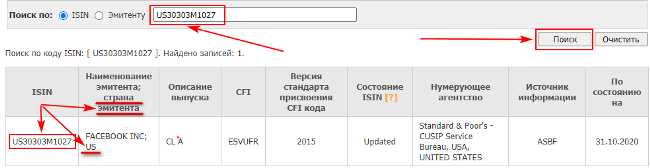 Это лучше сделать по коду ISIN, он есть у каждой акции. Его можно узнать из карточки с описанием ценной бумаги на бирже или в отчете брокера. Переходим на сайт НРД и проверяем акцию по ISIN. US – это США. Сокращения других стран можно посмотреть здесь. На изображении ниже представлен пример по Facebook.