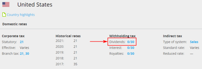Ставку можно посмотреть здесь. Ниже представлена ставка по дивидендам в США.