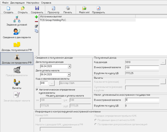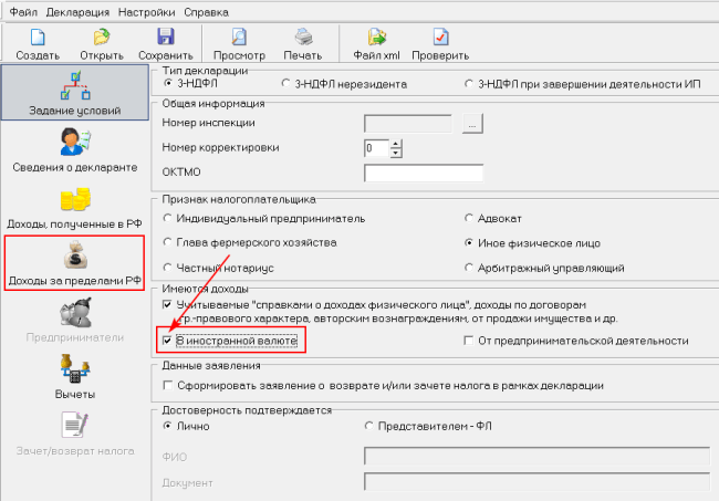 Нас интересует вкладка “Доходы за пределами РФ”. При первом входе в программу она неактивна. Чтобы ее активировать, надо поставить галочку в строке “Имеются доходы в иностранной валюте”.