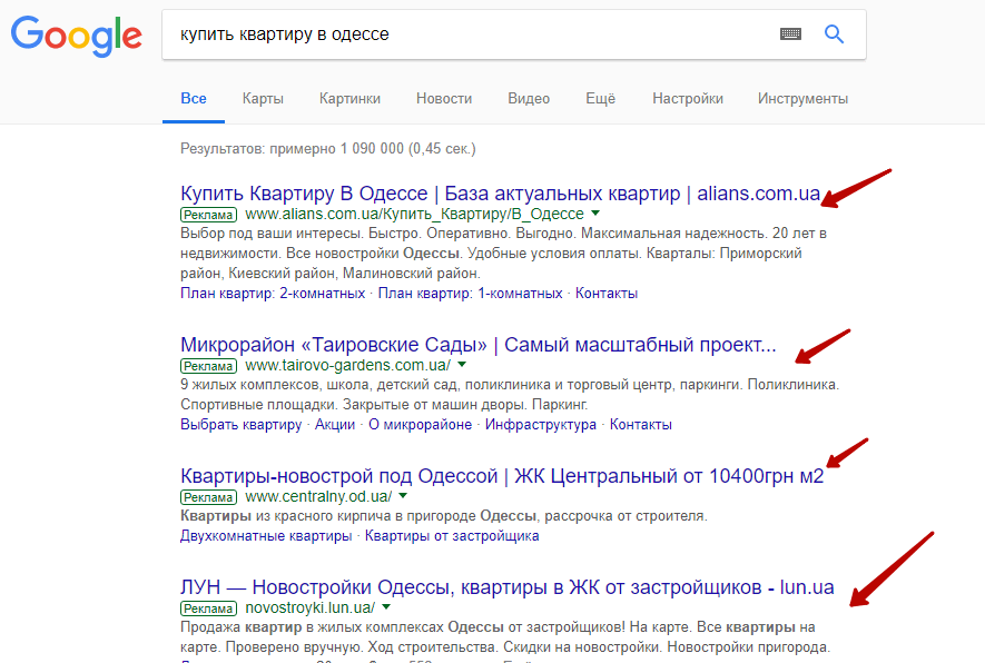 Контекстная реклама – это объявления на странице результатов поиска, которые видит пользователь, введя определенный поисковый запрос. Эти объявления отвечают его запросу и размещаются вверху и внизу страницы – что в Яндексе, что в Google.