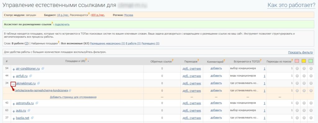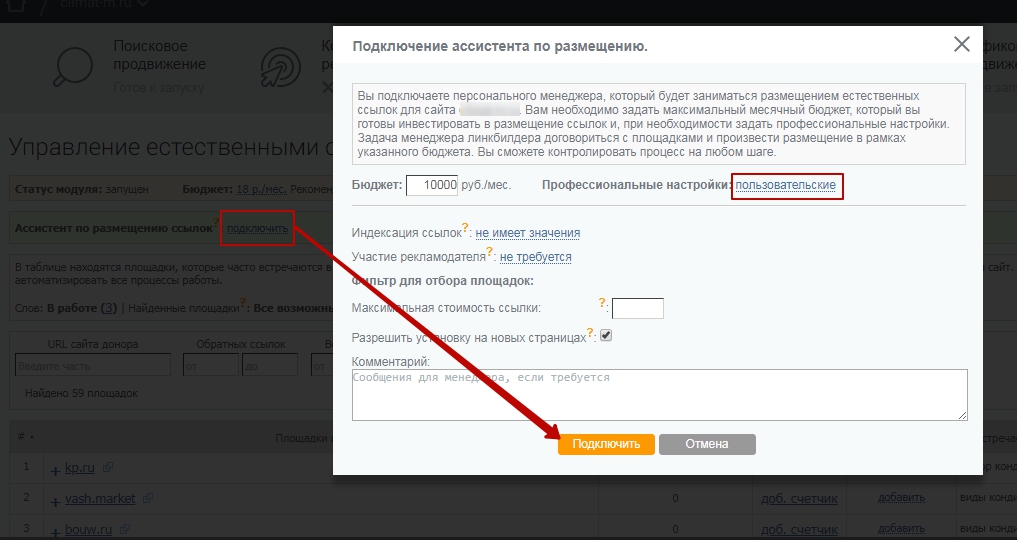 Подключите ассистента по размещению ссылок после того, как система спарсит выдачу и подберет список площадок.