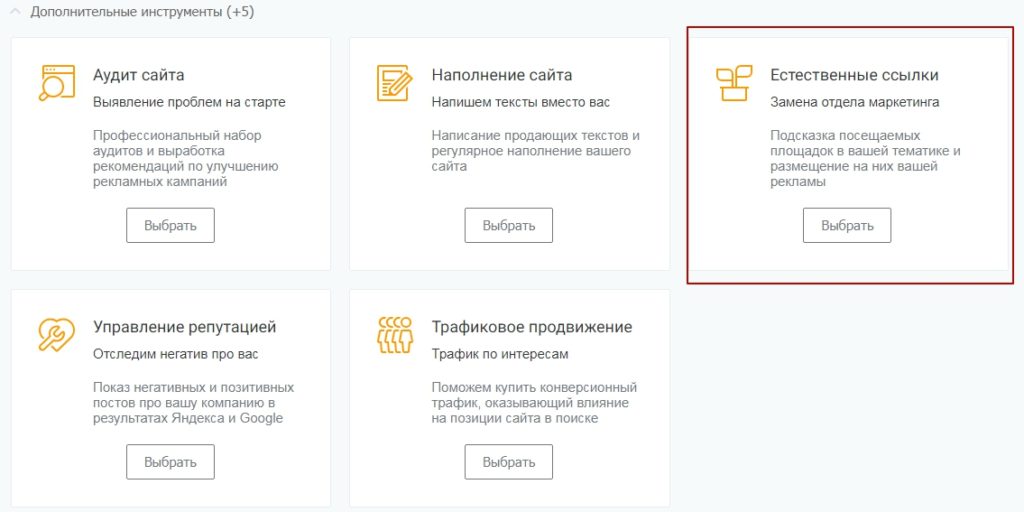 Если у вас еще нет аккаунта в системе PromoPult, зарегистрируйтесь и нажмите на кнопку «Создать проект». Система предложит список инструментов для выбора, выберите «Естественные ссылки».