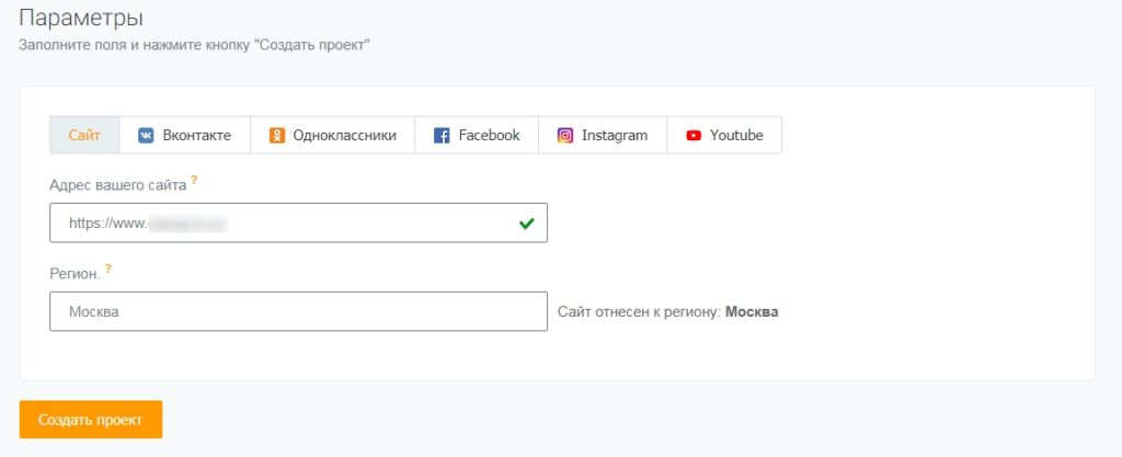 На следующем шаге укажите адрес своего сайта и регион продвижения: