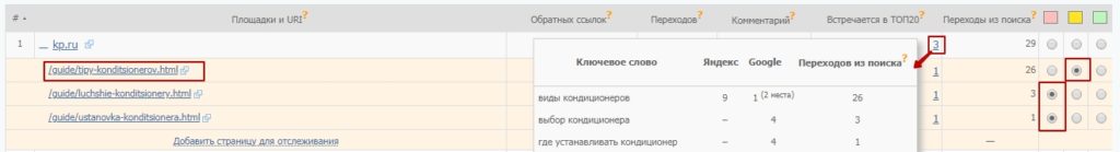 - Встречается в ТОП-20. В этом столбце система сообщает, по какому запросу страница находится в ТОПе. По клику на цифре в ячейке также можно посмотреть, какую позицию занимает страница в выдаче.