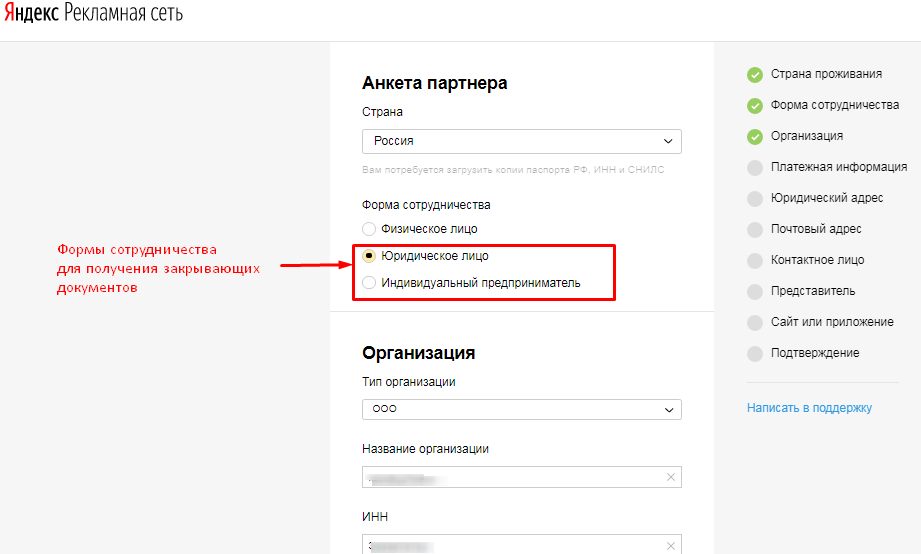 Внимательно заполняйте анкету во время регистрации. Укажите свою страну и выберите организационно-правовую форму. Внесите данные об организации, укажите платежную информацию, юридический и почтовый адрес, контактное лицо, представителя, информацию о сайте или приложении.