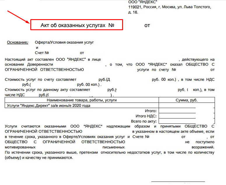 Акт об оказанных услугах — первичный учетный документ, который подтверждает факт оказания услуг Яндекс.Директом юрлицу или ИП. Содержит данные о стоимости и объеме услуг.