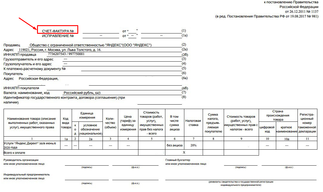 Обратите внимание, что номер и название рекламной кампании в акте и счете-фактуре не указываются.