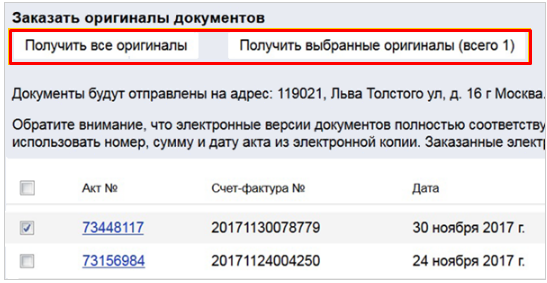 В форме «Заказать оригиналы документов» закажите оригиналы для всех или для определенных документов. В первом случае в результатах поиска выберите «Получить все оригиналы», во втором — выберите «Получить выбранные оригиналы» и отметьте нужные акты.