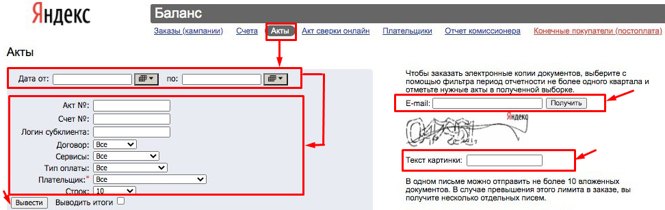 Заказ копий актов также осуществляется в Яндекс.Балансе на странице «Акты». Копии документов отправляются на электронную почту.
