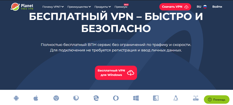 Воспользуемся одним из бесплатных VPN, например, Planet. Заходим на официальный сайт программы, скачиваем и устанавливаем её на компьютер.