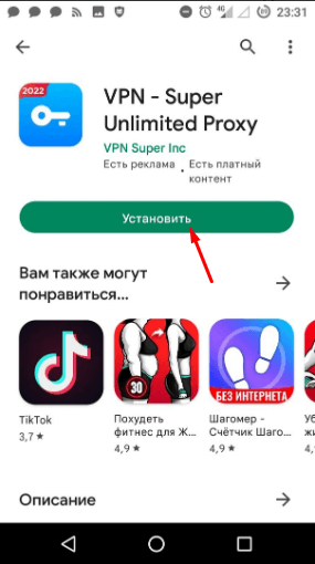 Зайдем в магазин Google Play и установим VPN, выбрав один из бесплатных вариантов, например, Super Unlimited Proxy.