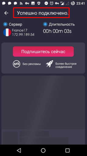 По завершении подключения к удаленному серверу появится сообщение «Успешно подключено» и отобразится текущий IP-адрес, с указанием страны (в данном случае – Франция).