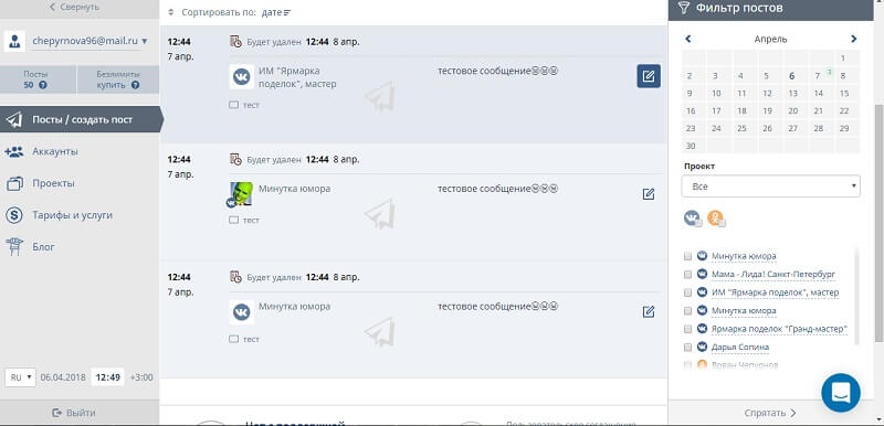 В дальнейшем все посты будут отображаться в личном кабинете с фильтрами, указанием страниц, времени публикации и других параметров. Их можно будет удалить или отредактировать, а для удобства просмотра можно будет переключаться между вкладками опубликованных и запланированных постов.