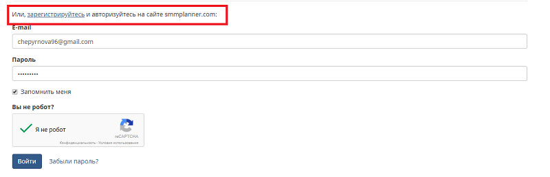 Чтобы зарегистрироваться в сервисе, проходим на smmplanner.com и нажимаем на кнопку «Вход/регистрация» в верхнем правом углу экрана.