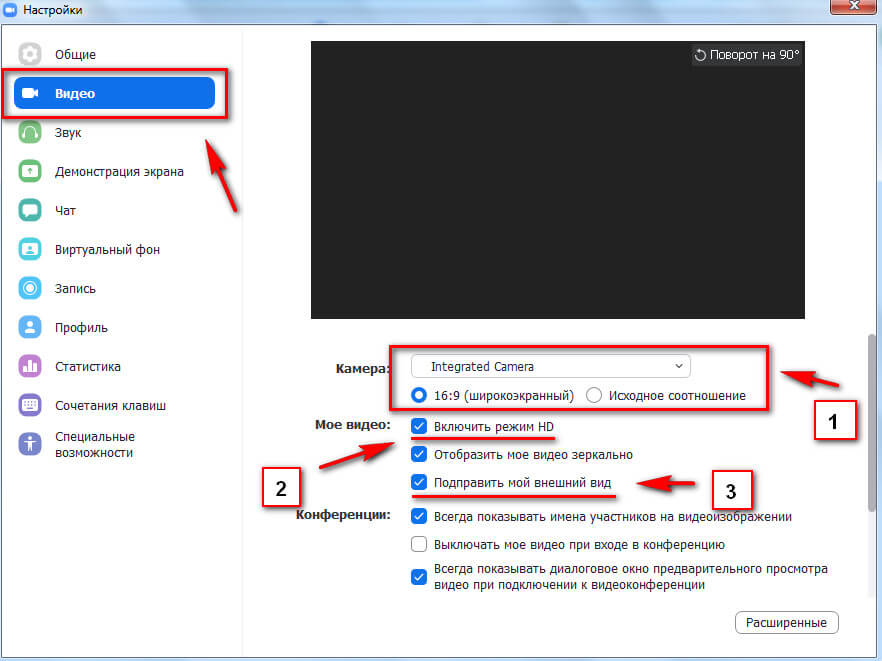 - Видеоизображение – здесь можно включить/отключить видео у организатора и участников конкретной встречи.