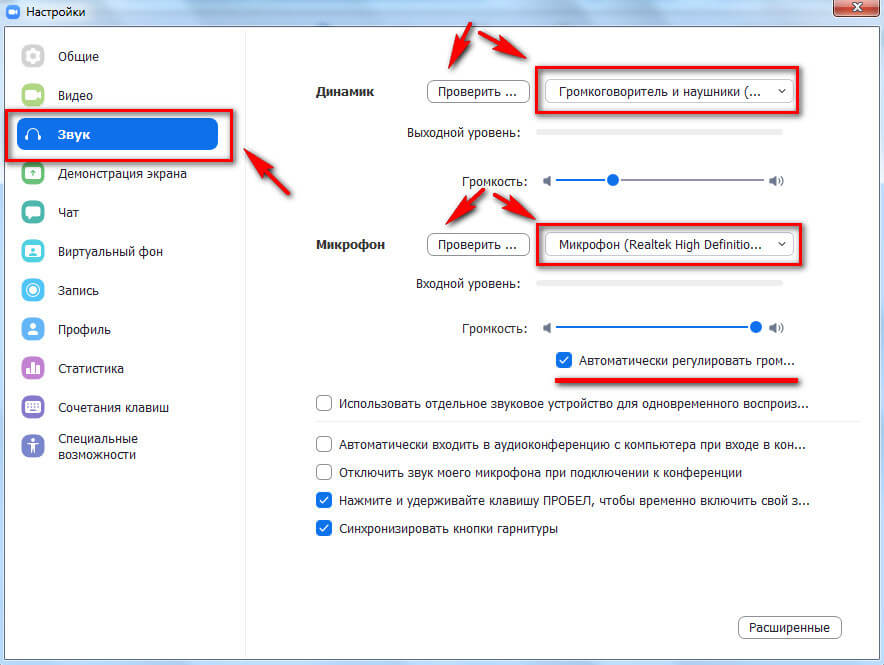 Звук. Нужно проверить подключение и настройки динамиков и микрофона. Можно настроить свою громкость для программы или оставить галочку напротив пункта «Автоматически регулировать громкость».