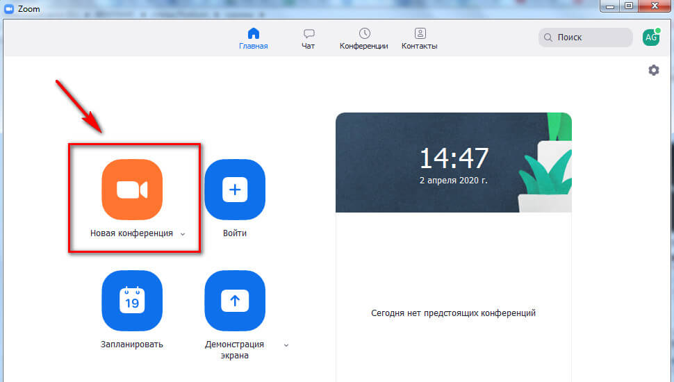 Начать конференцию можно двумя способами. Первый – запускаем программу на ПК и в главном окне нажимаем «Новая конференция».