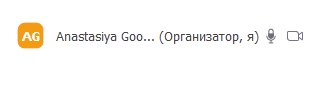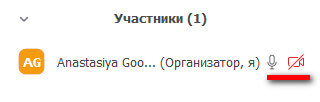Возле каждого участника отображаются значки микрофона и камеры. Перечеркнутый значок означает, что микрофон или камера выключены. На скрине ниже видно, что камера выключена, а микрофон работает.