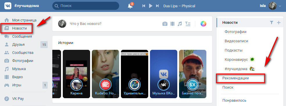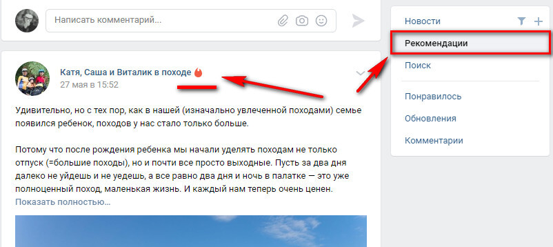 Это лента с постами, которые могут быть вам интересны. Чтобы ее посмотреть, заходим в раздел «Новости». Справа блок, который тоже называется «Новости», ниже раздел «Рекомендации».