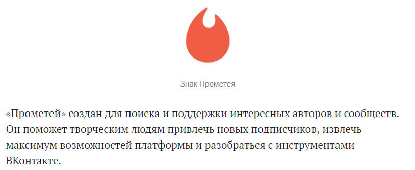 Прометей — это название одного из алгоритмов ВКонтакте. Его задача — при помощи искусственного интеллекта отбирать уникальный качественный контент, вызывающий повышенный интерес у пользователей, и дополнительно его продвигать. Алгоритм может отметить как отдельный пост, так и целое сообщество значком «огонь Прометея», что гарантирует попадание в рекомендации и хороший охват.