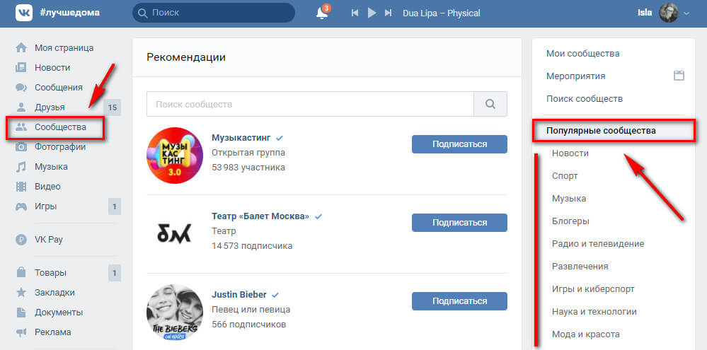 Чтобы посмотреть рекомендованные сообщества — жмем слева на «Сообщества», а в блоке справа на «Популярные сообщества». Их можно отфильтровать по категориям.