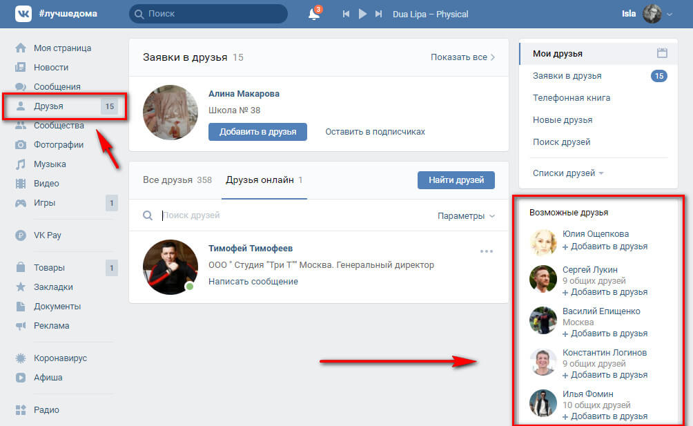 А еще если зайти в раздел «Друзья», справа появится блок «Возможные друзья».