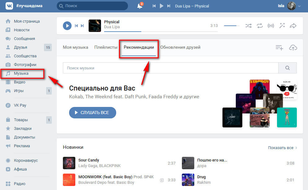 Заходим в раздел «Музыка» и нажимаем на «Рекомендации».