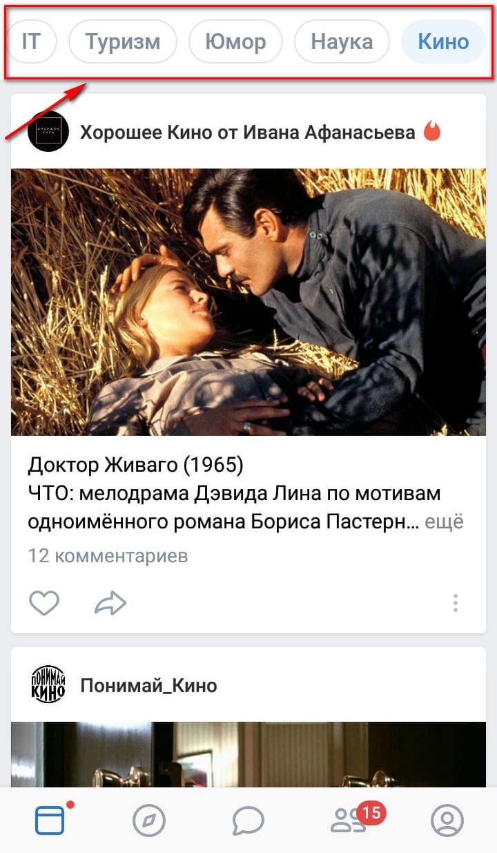 Если прокрутить Интересное влево, то вверху появляются категории контента — эта тематическая лента. Например, можно посмотреть контент только на тему туризма или IT.
