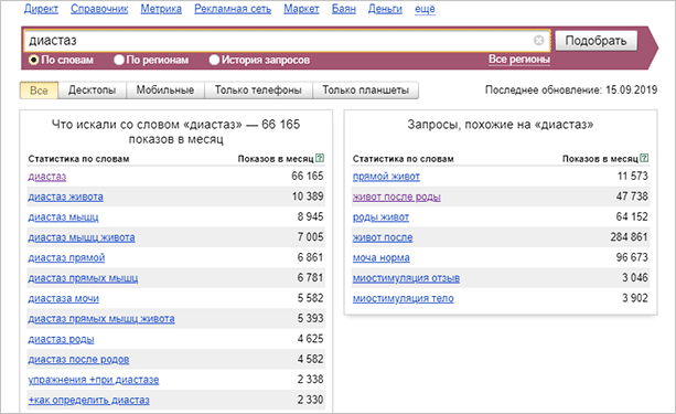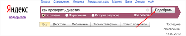 - “[]” – слова, заключенные в квадратные скобки, идут в том порядке, в каком вы их написали. Важно для оценки частотности запроса с дополнительными ключами. Пример: “[как проверить диастаз]” (без кавычек).