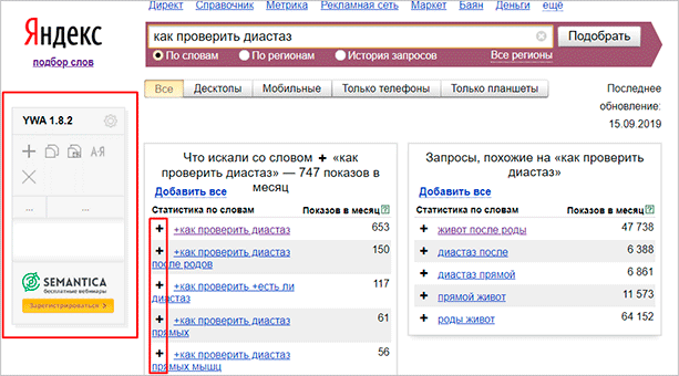 Чтобы добавить слово в Yandex Wordstat Assistant, нужно нажать на “+” рядом.