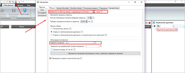 Шаг 2. Откроем настройки, чтобы сделать парсинг продуктивным. В общем разделе мы ограничили размер поисковых фраз до 7 слов. Слишком большие не нужны.