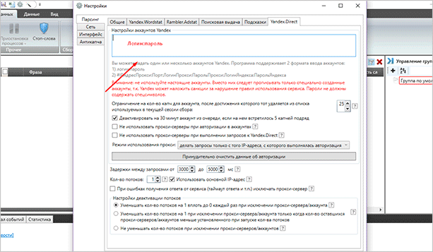 Чтобы получить доступ к подбору фраз из левой колонки, необходимо привязать Яндекс-аккаунт. Для этого перейдите: “Настройки” → “Yandex.Direct”. Укажите данные профиля в формате “логин:пароль”. К примеру, “Kusachka:1234”. Нажмите “Сохранить изменения”.