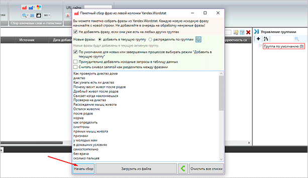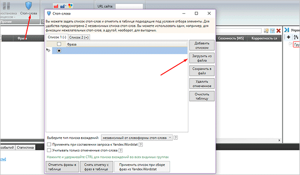 Шаг 4. Собираем семантическое ядро из левой колонки. Загружаем из txt-файла или пишем вручную.