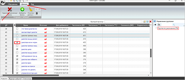 Шаг 5. Удаляем мусор из списка до сохранения. К сожалению, иногда попадаются лишние слова. Отмечаем их галочкой. Во вкладке “Данные” кликаем на красный крестик.