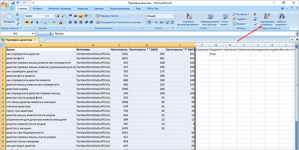Шаг 8. Упорядочим слова по частотности в таблице. Выделяем все. Нажимаем “Сортировка и фильтр” в правом углу.