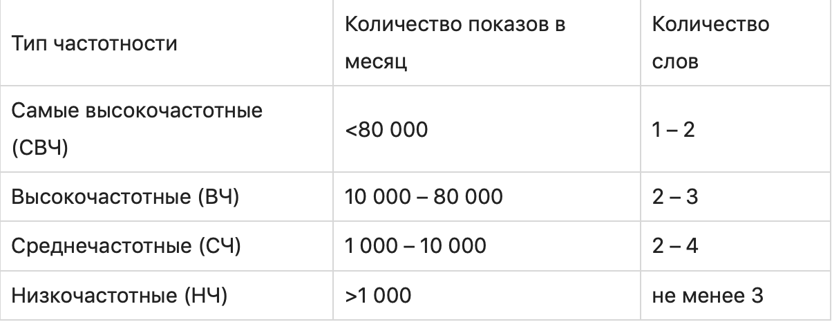 Молодой сайт лучше оптимизировать под низкочастотные запросы. Чтобы определить, к какому типу относится ключевое слово, пользуйтесь табличкой.