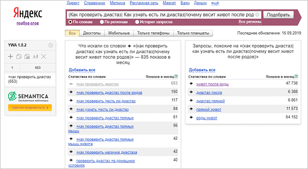 Пользуйтесь оператором “(запрос|запрос|запрос)”, чтобы быстрее проверить частотность. Вы увидите информацию сразу о нескольких ключах одновременно. Больше 5 фраз вводить одновременно нельзя.