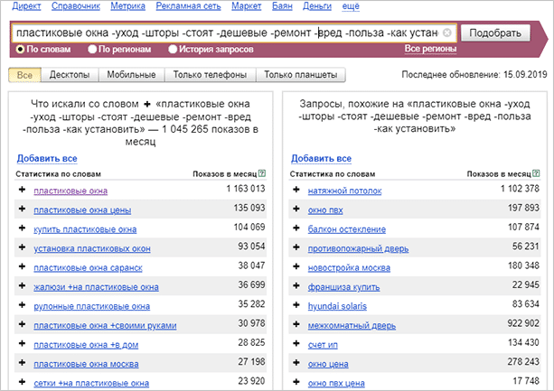 Оператор “-” убирает ненужные слова. Допустим, продажа элитных пластиковых окон. Тогда мы формулируем запрос так: “пластиковые окна -дешевые -шторы -ремонт -как установить”. В итоге мы получаем целый список годных слов для продвижения.