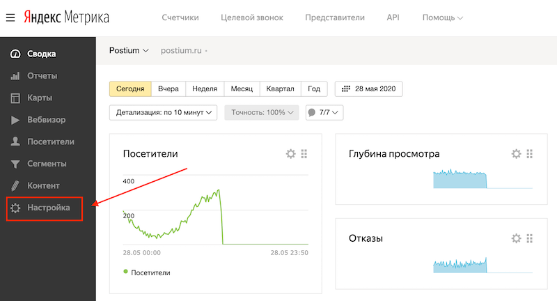 Открываем свой счётчик Яндекс.Метрики и кликаем пункт «Настройка» (самый последний в меню слева).