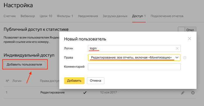 Чтобы добавить человека, которые сможет посмотреть отчёты Метрики по сайту, нажмите «Добавить пользователя», укажите его логин в Яндексе и установите уровень доступа в пункте «Права».