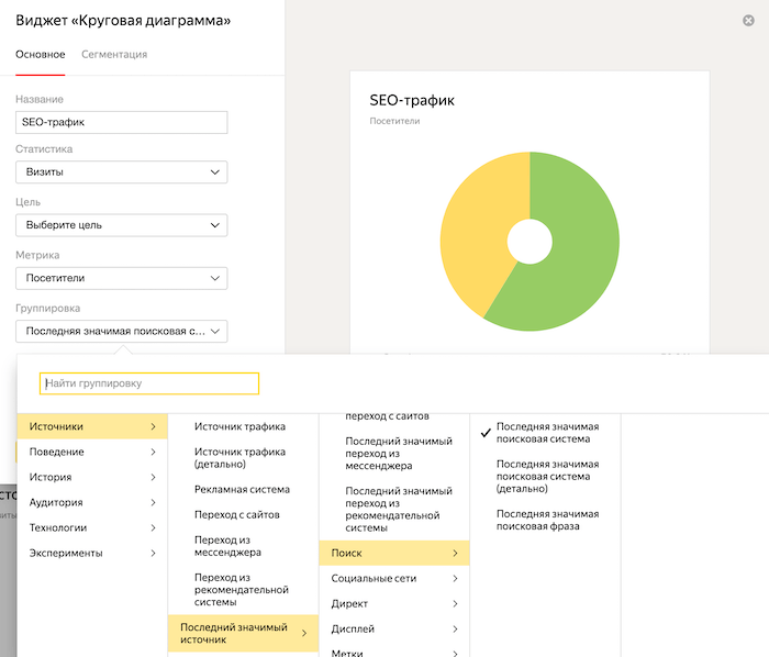 SEO-трафик. Для того, чтобы создать первый виджет жмём «Создать виджет — Круговая диаграмма», открывается окно с настройками виджета. В названии пишем «SEO-трафик», в пункте Метрика выбираем «Посетители», в пункте Группировка — «Источники — Последний значимый источник — Поиск — Последняя значимая поисковая система».