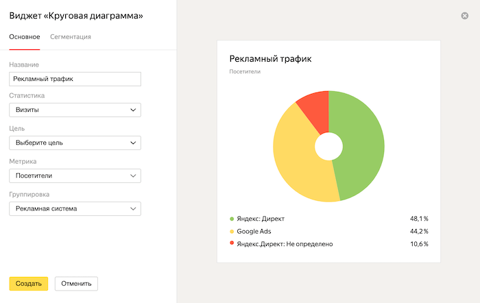 Рекламный трафик. Создаём виджет «Круговая диаграмма». В названии пишем «Рекламный трафик», в пункте Метрика выбираем «Посетители», в пункте Группировка — «Рекламная система».