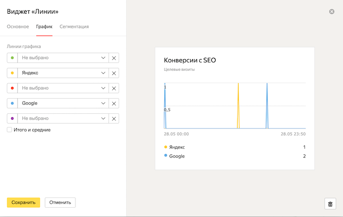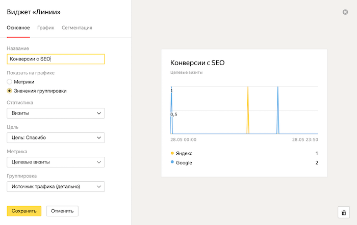 Конверсии с SEO. Чтобы видеть, как конвертируется наш SEO трафик создаём новый виджет «Линии». В названии пишем «Конверсии с SEO», указываем цель из Метрики, которая будет считаться конверсией. В пункте Метрика выбираем «Целевые визиты», в пункте Группировка — «Источники трафика (детально)».