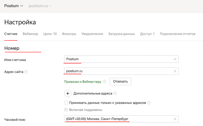 Здесь вы можете посмотреть номер счётчика, связать счётчик с аккаунтом в Вебмастере, поменять имя счётчика и адрес сайта, с которого он собирает информацию. Также можно указать часовой пояс, указать дополнительные URL-адреса или удалить счётчик.