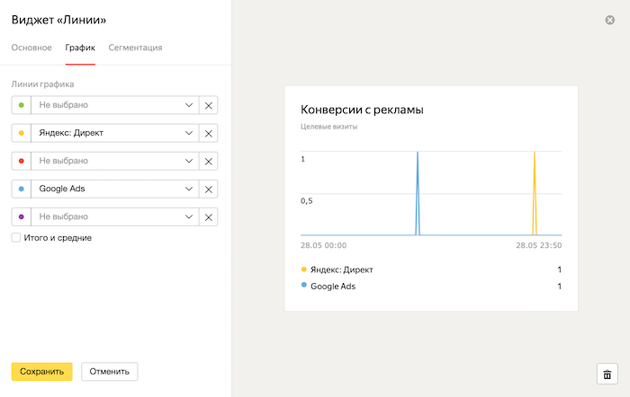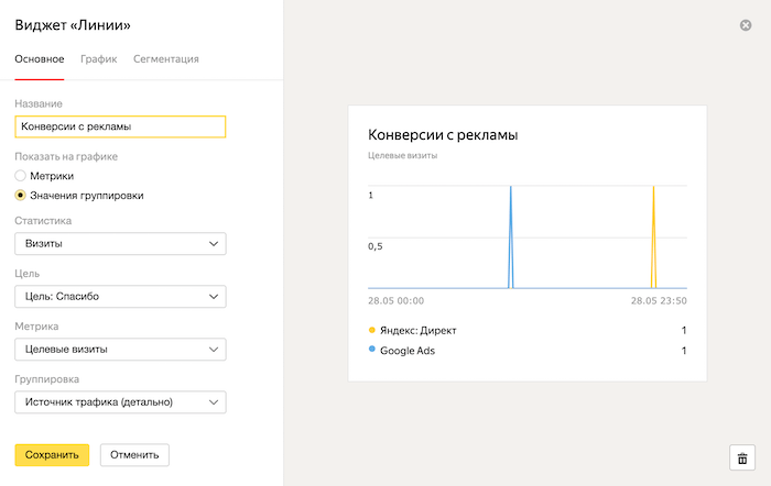 Конверсии с рекламы. Создаём виджет «Линии». В названии пишем «Конверсии с рекламы», выбираем цель, в пункте Метрика выбираем «Целевые визиты», в пункте Группировка — «Источники трафика (детально)».