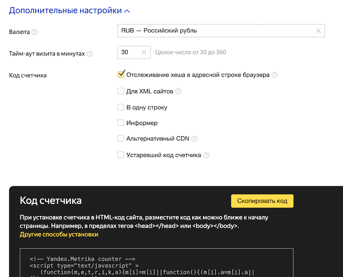 Ещё ниже есть дополнительные настройки и сам код счётчика. Чтобы открыть дополнительные настройки, кликаем на них.