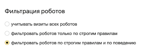 Если вы хотите обнаружить большинство роботов, используйте «Фильтровать роботов по строгим правилам и по поведению». Если хотите, чтобы визиты роботов учитывались в Метрике, выберите «Учитывать визиты всех роботов».