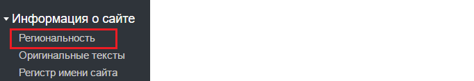 Если Вы ещё не сделали этого, кликайте на предыдущую ссылку. Для тех же, кто подошёл к этому уроку в полной боеготовности, нужно зайти в Вебмастер, перейти в раздел Информация о сайте и выбрать подраздел Региональность.
